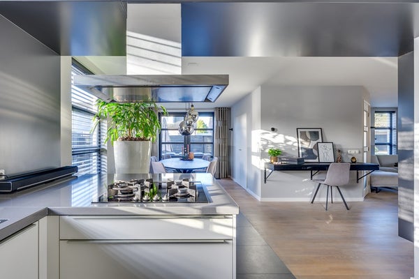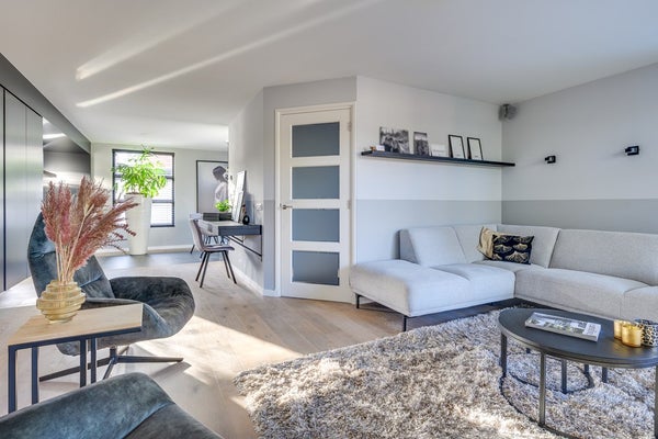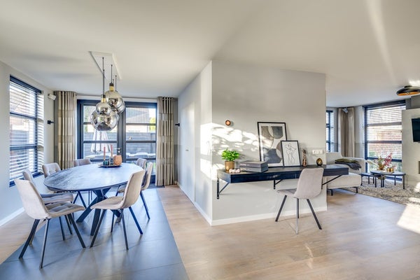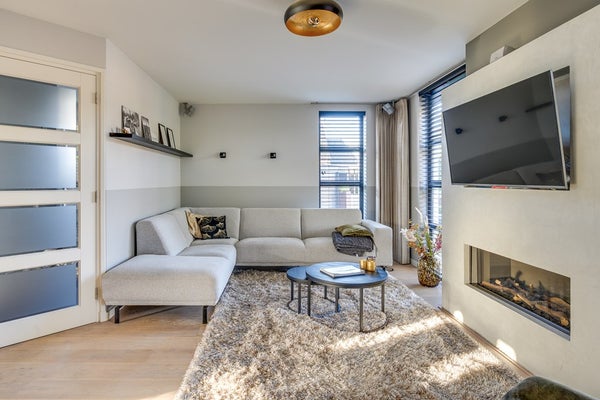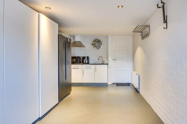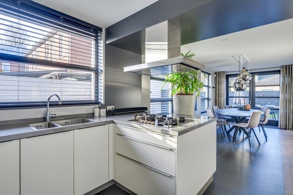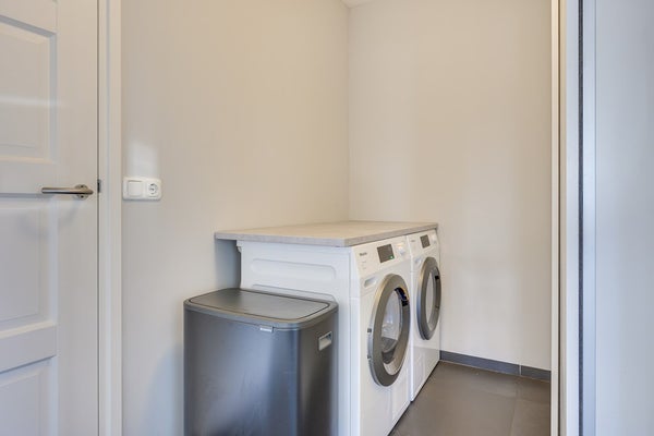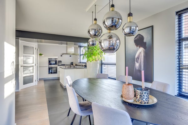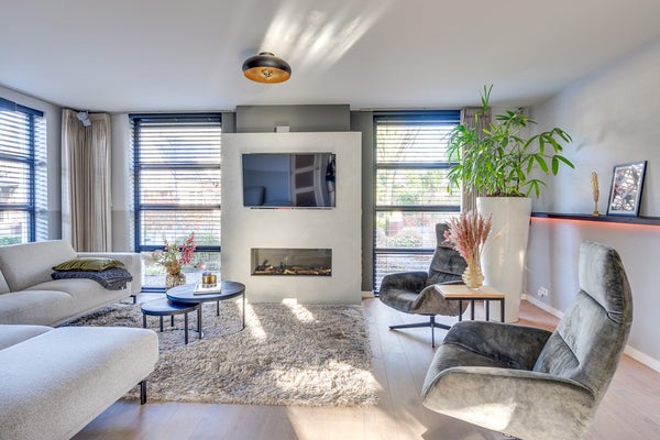 De tuingerichte woonkamer is sfeervol en warm dankzij de massief houten vloer en strakke schouw met haard. Grote raampartijen zorgen voor een prettige lichtinval en een fijne verbinding met buiten. Aan de achterzijde bevindt zich de riante open leefkeuken: een echte eyecatcher. Deze luxe keuken is compleet uitgerust met diverse inbouwapparatuur, een composiet werkblad in lichte tint en een extra breed blad aan de eetkamerzijde, perfect als eetbar voor een ontbijt of gezellige borrel.
