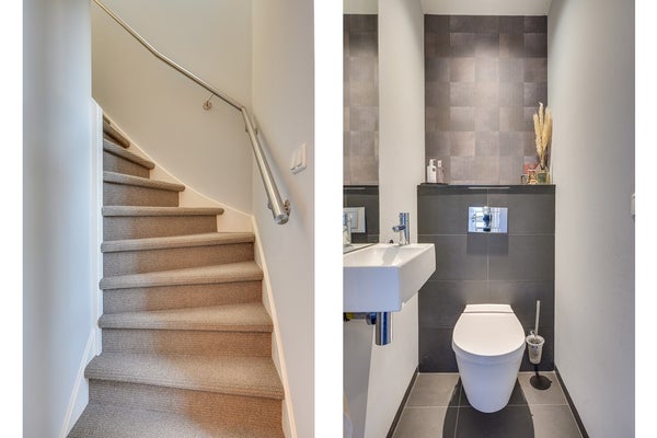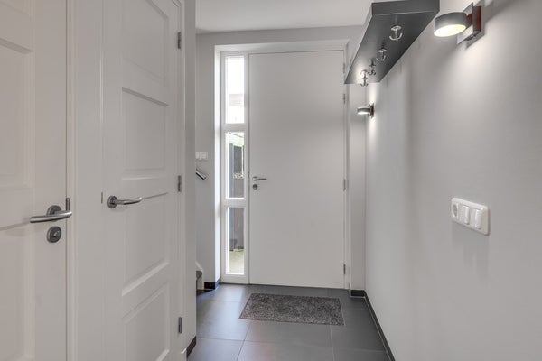 Via de hal, afgewerkt met een fraaie tegelvloer die is doorgelegd in de eetkamer, keuken en bijkeuken (voorzien van vloerverwarming), betreed je de woning. De luxe toiletruimte is modern uitgevoerd met een hangend closet en fonteintje. De meterkast beschikt over een uitgebreide groepenkast passend bij deze moderne woning en de lichte trapopgang geeft toegang tot de verdiepingen.