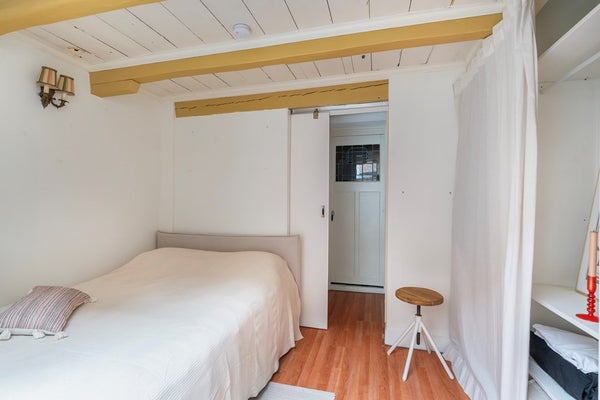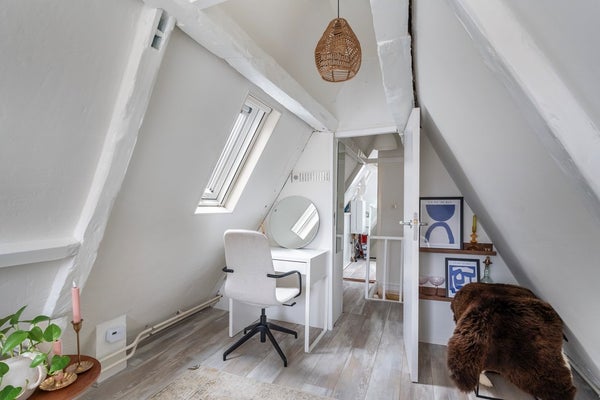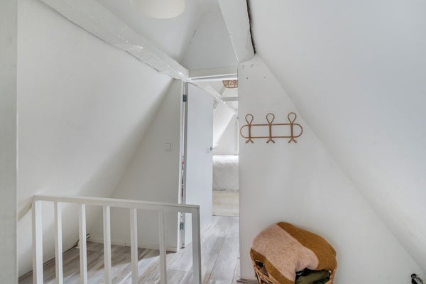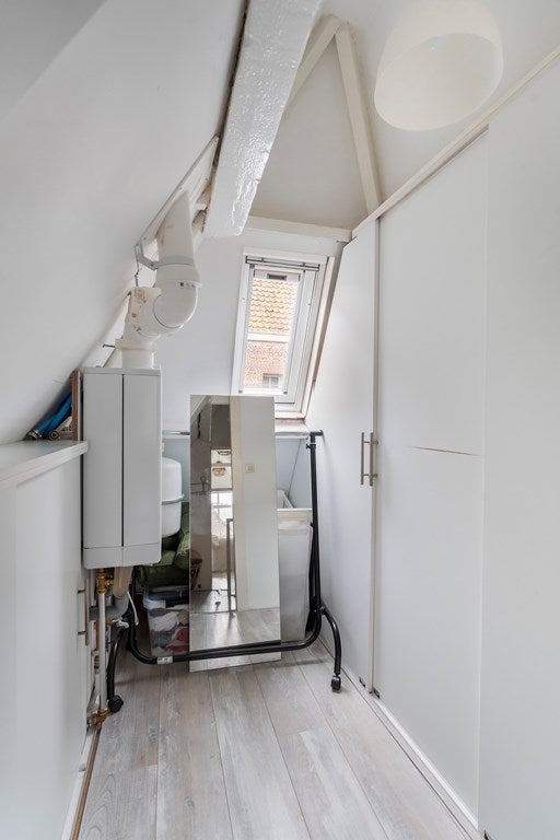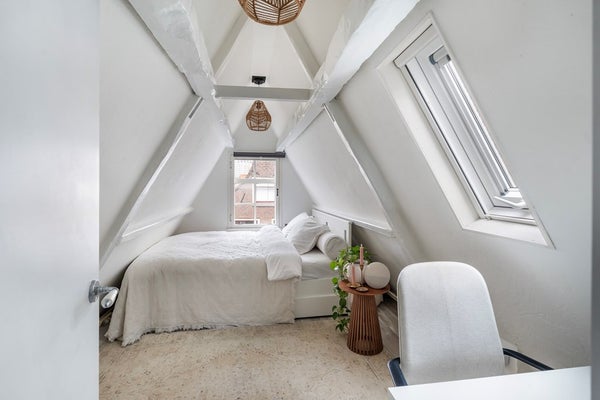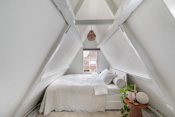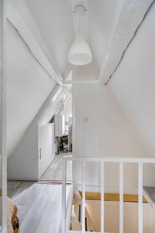 Via een vaste 'steek'trap is er toegang tot de sfeervolle slaapzolder. De prachtige kapconstructie met originele spanten is nog zichtbaar. Deze zolderverdieping is ook ingericht als slaapvertrek en heeft de beschikking over een groot raam aan de voorzijde, een Velux dakraam op het zijvlak en ook op het dak aan de achterzijde.