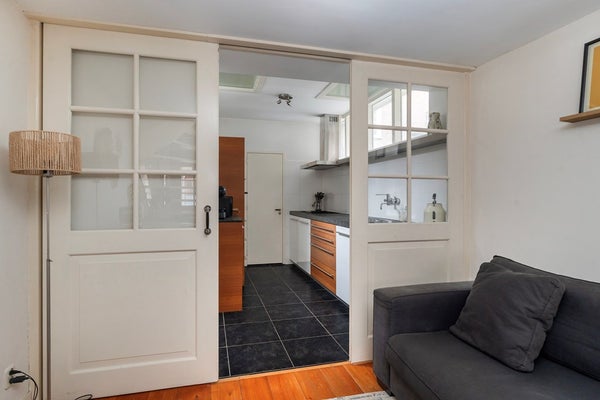 De begane grond heeft een winkelpui met daarachter een hal/ voorkamer die afgeschermd is met de woonkamer middels een fraai portaal (prachtig klassiek kozijn met roedeverdeling). Deze 'voorkamer' is ideaal aangezien hier o.a. de fietsen gestald kunnen worden plus dat de eerste 'kou' buiten de woonkamer gehouden kan worden. Kenmerkend voor de woonkamer is dat het een hele lichte ruimte is. Er is heel nuttig gebruik gemaakt van het vele licht dat aan de achterzijde (zuid) via de keuken naar binnen komt. Hierdoor wordt de woonkamer zowel vanuit de voorzijde als achterzijde verlicht. Wat een aangenaam gevoel geeft.