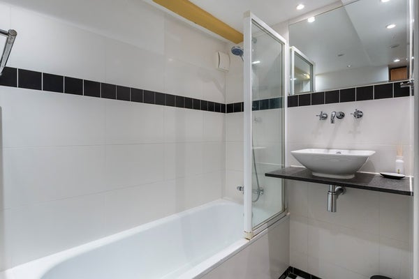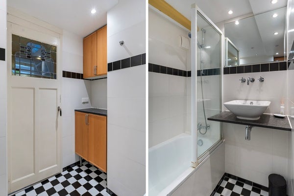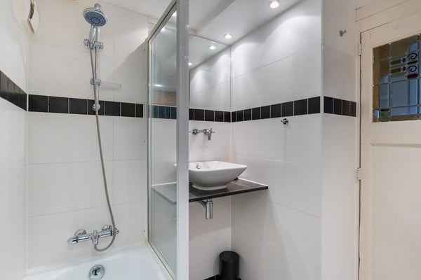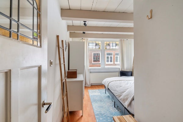 Nu weer naar binnen: De badkamer is in goed staat en is voorzien van een heerlijk ligbad, een natuurstenen blad met waskom, thermostaatkranen, kasten en een spiegel. Aan de voorzijde van deze etage bevindt zich nog een ruime slaapkamer. Deze ruime slaapkamer heeft de beschikking over prachtige glas-in-loodramen en kijkt uit op de gezellige Morsstraat.