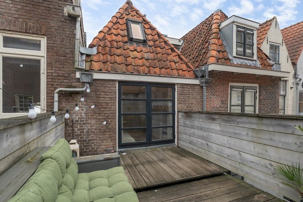 Via een tweetal grote ramen/ deuren van de achter-slaapkamer is het heerlijke dakterras - dat op het zonnige zuiden is gelegen - te bereiken. Veel bewoners in de Leidse binnenstad zullen jaloers op u zijn. Een heerlijke rustige en vooral ook zonnige plek. Doordat de achterburen 'de Stadstimmerwerf' een stuk naar achter is gelegen, komt er mede door de schuine kap al heel vroeg op de dag, tot aan het begin van de avond (en zomers nog later) veel zon op het terras. Daarnaast is het een heel rustig gelegen plekje.