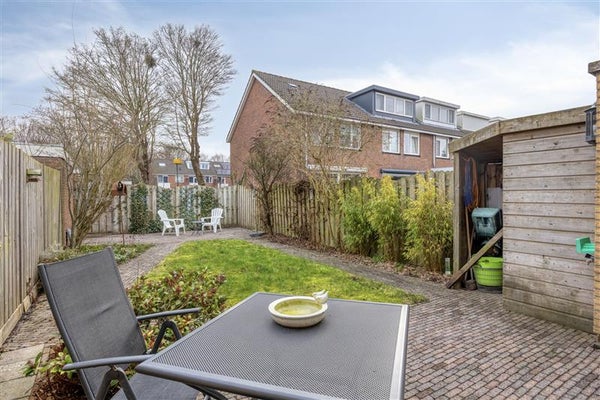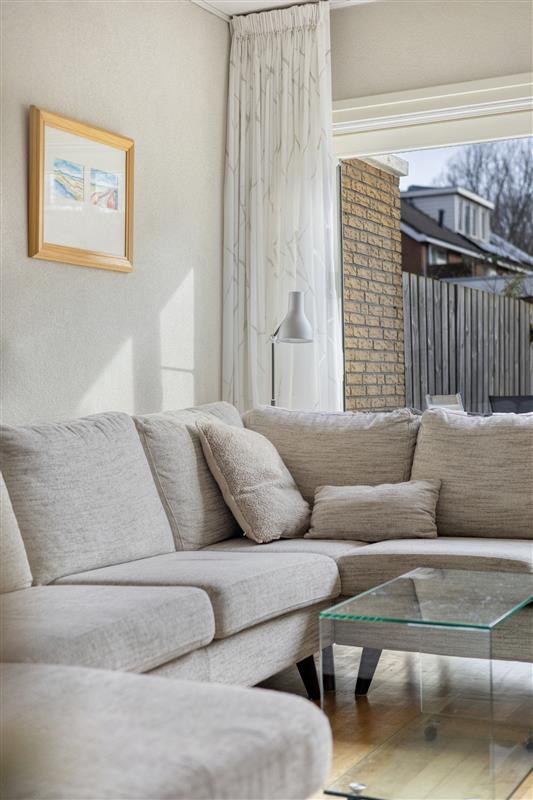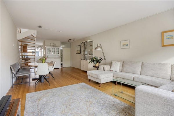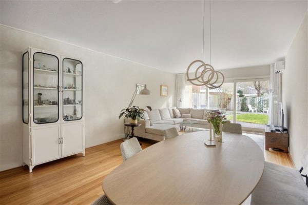 De ruime lichte woonkamer is voorzien van een mooie houten vloer en ook een airconditioning (voor koeling en verwarming) is aanwezig. De driedelige schuifpui geeft ruim toegang tot de grote achtertuin waar je tot 19:00 uur 's avonds van de zon kunt genieten. De achtertuin is ook voorzien van een kleine schuur en achterom.