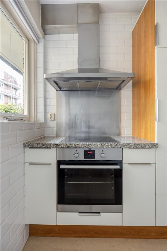 De moderne open keuken met granieten aanrechtblad is gelegen aan de voorzijde van de woning en is voorzien van diverse inbouwapparatuur waaronder een inductiekookplaat, oven, ingebouwde combi-magnetron, vaatwasser en koelkast met vriesvak.