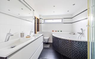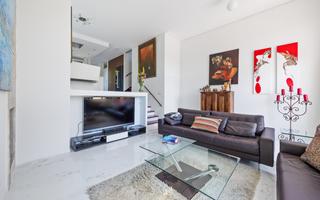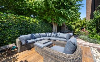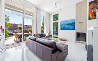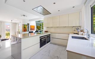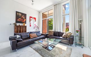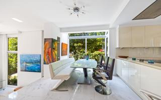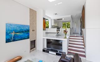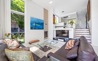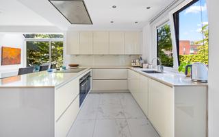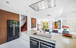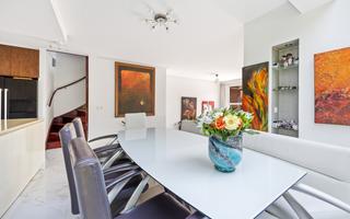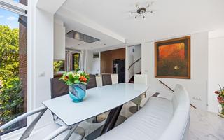 De split-level indeling leidt je via de hal met een toiletruimte naar de grote open keuken, compleet met moderne inbouwapparatuur. De woonkamer, met hoge plafonds en veel daglicht, biedt toegang tot de achtertuin. De tuin is voorzien van twee terrassen en een grote barbecue.