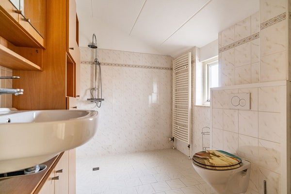 Overloop met toegang tot de ruime badkamer met toilet. Op deze verdieping bevinden zich drie slaapkamers, ideaal voor een gezin, thuiswerken of logeerruimte.