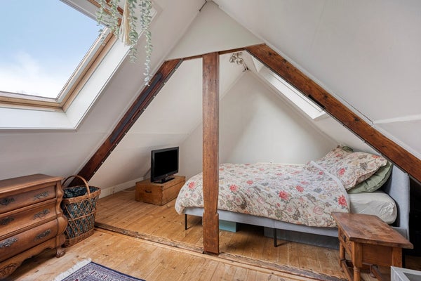 Een heerlijke tweede slaapkamer met dakramen en een fijne, open sfeer. Vanuit deze kamer kijk je uit over de karakteristieke bebouwing van de stad, met zicht op onder andere het voormalige Elisabeth ziekenhuis.
