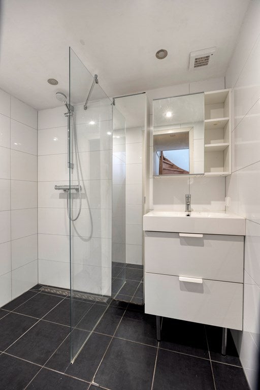 We gaan naar boven. Een overloop met de aansluiting voor de wasmachine en de CV ketel en toegang tot de nette, moderne badkamer met inloopdouche en wastafelmeubel.