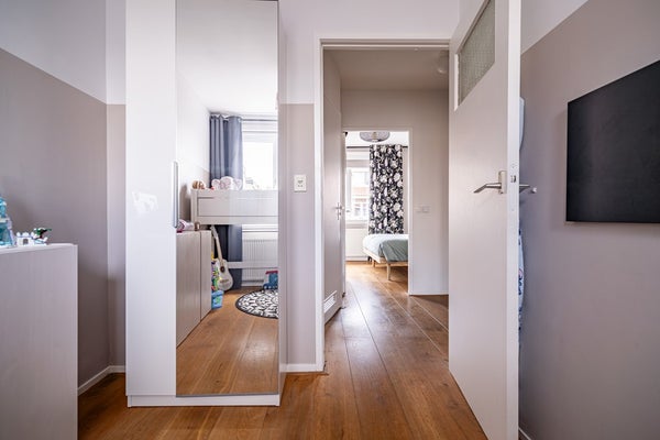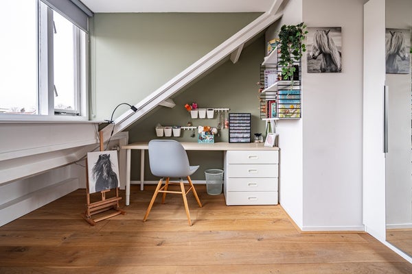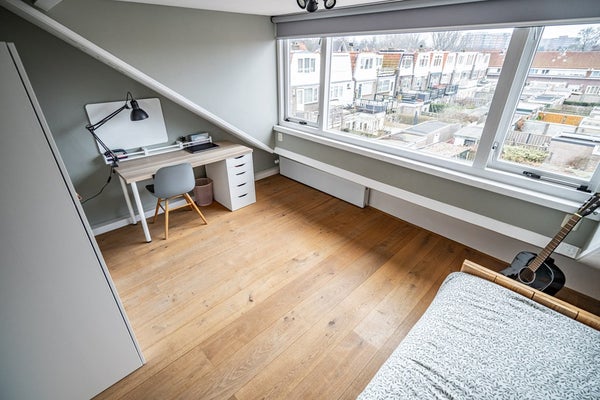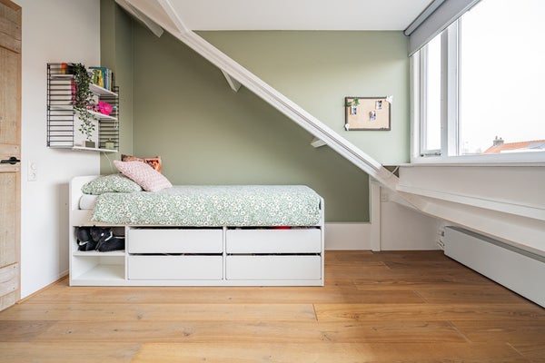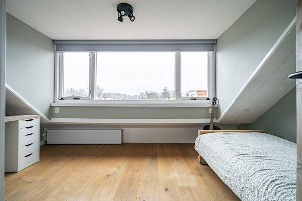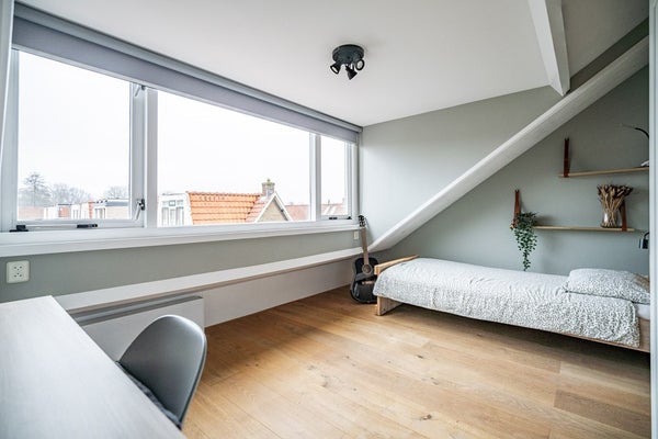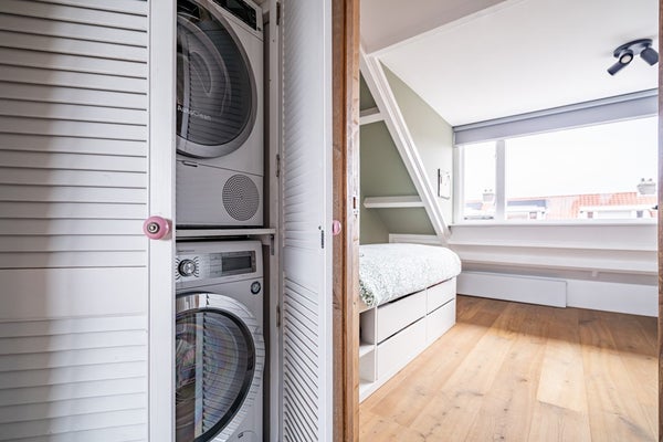 De tweede verdieping telt twee volwaardige slaapkamers. Dankzij de dakkapellen is hier verrassend veel ruimte en licht aanwezig, wat deze verdieping bijzonder prettig maakt. Op de overloop vindt u de opstelling voor wasmachine en droger. Het dak is geïsoleerd en bij de dakkapel op het zuiden is zonwering aanwezig. De Intergas combiketel (circa 9 jaar oud, eigendom) is eveneens op deze verdieping geplaatst.