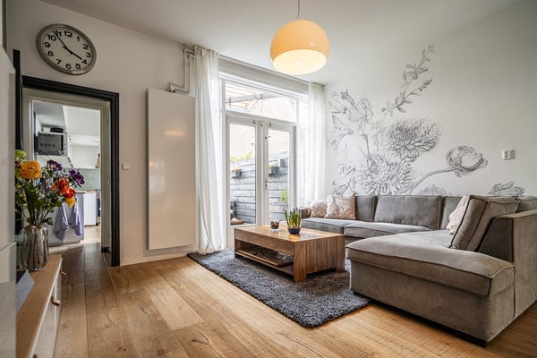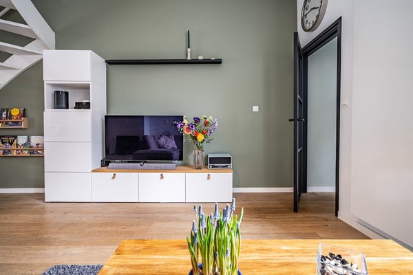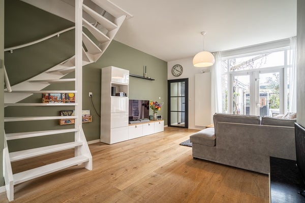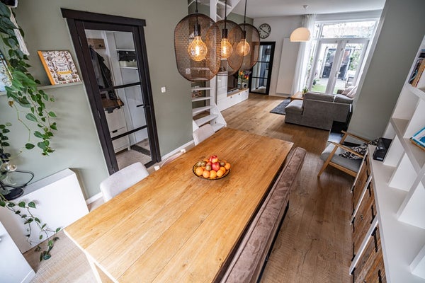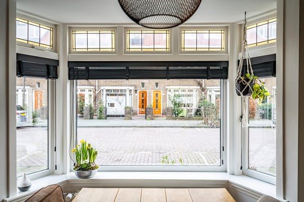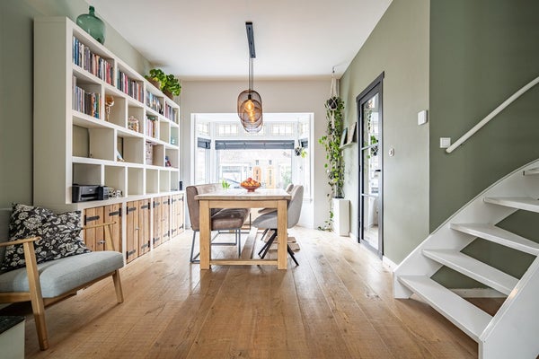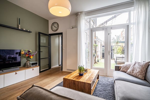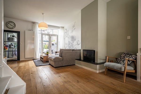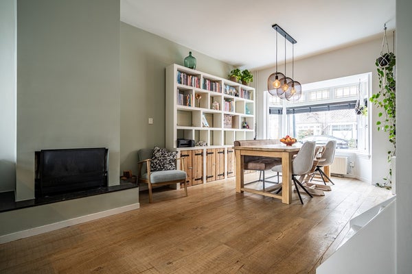 Bij binnenkomst ervaart u direct het echte wow-effect: een hoog plafond, een prettige lichtinval en een warme, uitnodigende sfeer. De woonkamer is voorzien van een mooie houten vloer, een charmante erker en karakteristiek glas-in-lood met voorzetramen, wat zorgt voor een unieke en huiselijke uitstraling. De open haard maakt het geheel compleet en nodigt uit tot lange, gezellige avonden. Via de openslaande deuren bereikt u de zonnige achtertuin, waardoor binnen en buiten naadloos in elkaar overlopen.