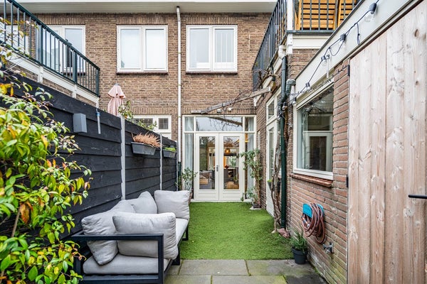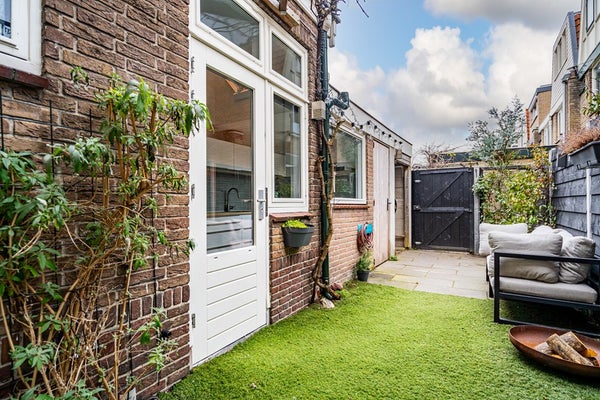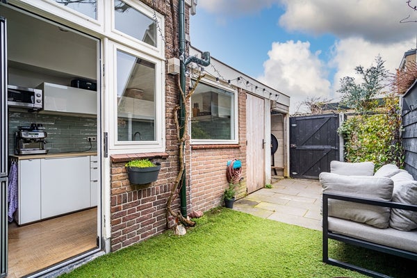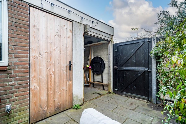 De zonnige achtertuin op het zuiden is een fijne verlenging van de woonruimte. De tuin beschikt over een achterom en een stenen berging met elektra en biedt volop ruimte om te ontspannen, te spelen of gezellig te tafelen.