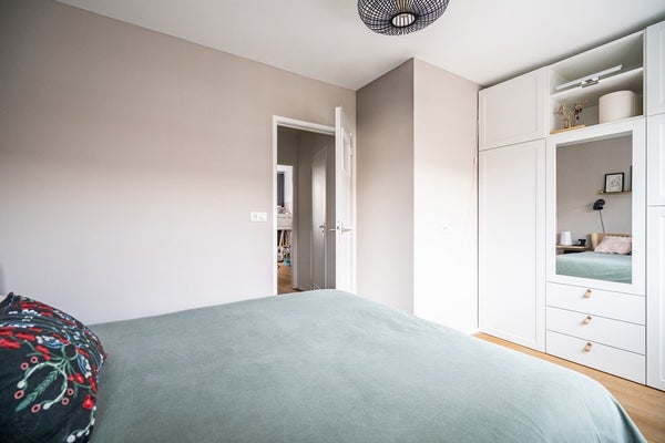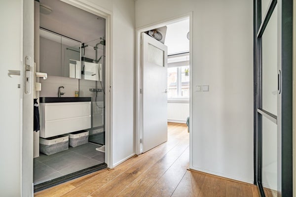 Op de overloop bevindt zich een praktische schuifdeur, wat zorgt voor een rustige en nette afwerking.