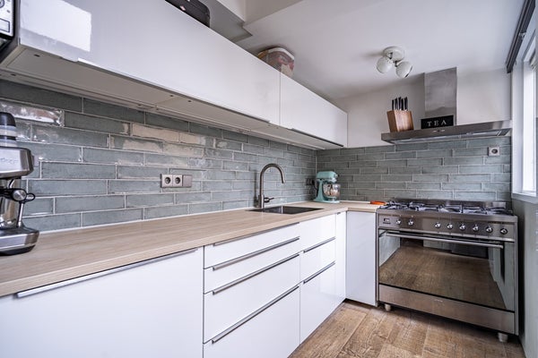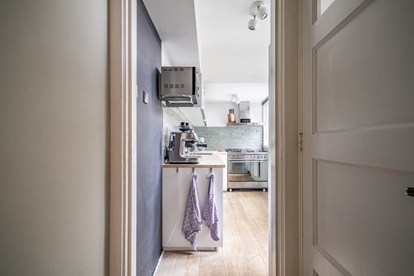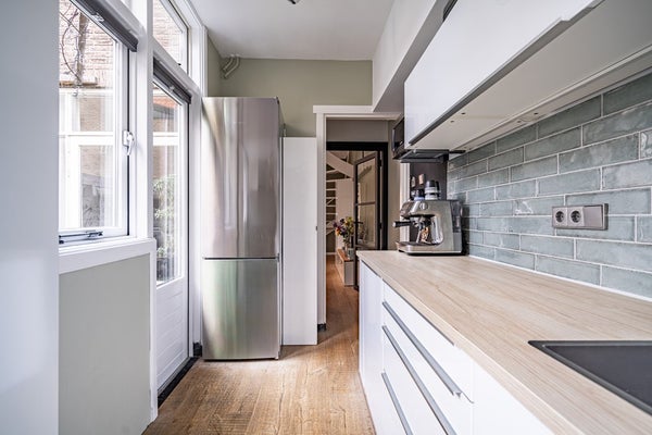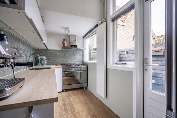 De stijlvolle steel look binnendeur springt direct in het oog en is ook toegepast bij de toegang tot de keuken. Deze moderne touch vormt een prachtig contrast met het karakter van de woning.
