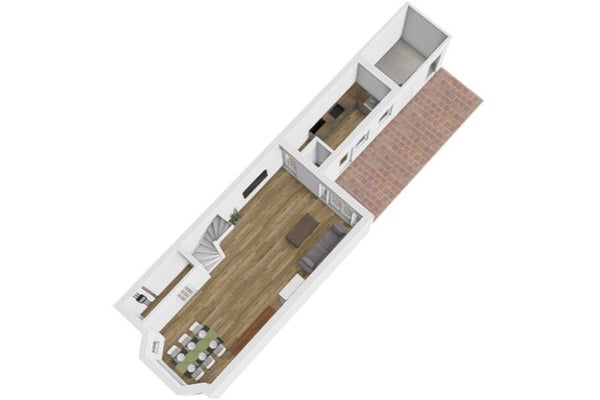 The kitchen, located at the rear of the house, has recently been updated with new tiles and a new countertop and also provides access to the garden. The toilet is also located at the rear.