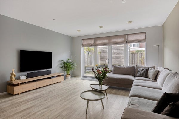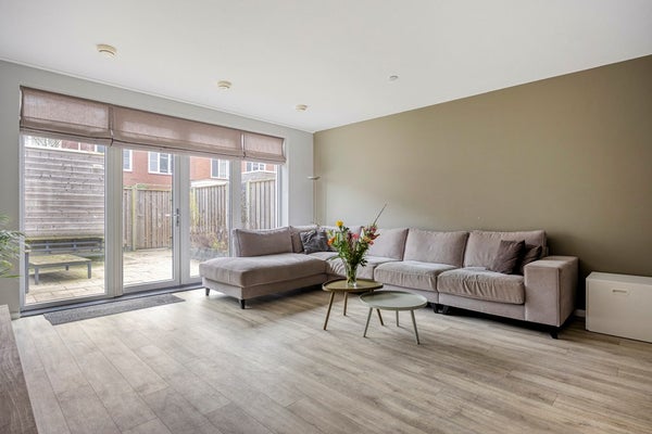 Wandel de straat in, want je kan niet met de auto hier komen. Heerlijk voor spelende kinderen en de rust. Je komt binnen in een ruime entree met de meterkast, het moderne toilet met een fontein en de trap naar boven. De breedte en het gevoel van ruimte vallen direct op. En dat is pas in de gang. Door naar de woonkamer. Die is echt uitzonderlijk ruim: bijna 5 meter breed en circa 7,5 meter diep. Vanuit de bouw is al gekozen voor een uitbouw waardoor je echt ruimte hebt. Dankzij de openslaande deuren stroomt het licht naar binnen en loopt je zo de tuin in. Het geheel is mooi en straks afgewerkt op de vloer (PVC) en de wanden en genoeg ruimte voor al je meubels.