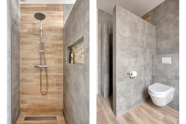 De badkamer is modern, luxe en volledig van nu: Naast een ruime inloopdouche, is er een dubbele wastafel met modern meubel, een tweede hangend toilet en vloerverwarming. Gewoon af.