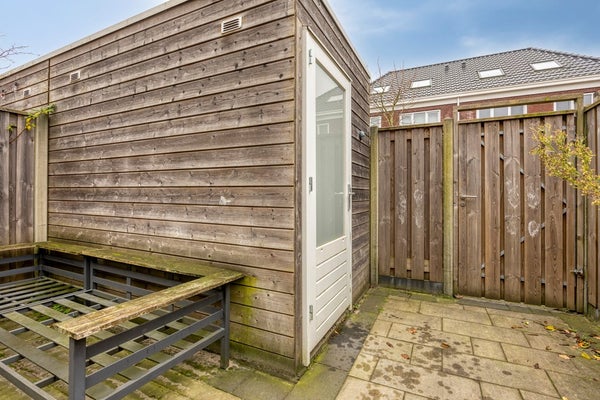 De tuin van ca. 35m2 ligt op het zuidoosten, waardoor je een groot gedeelte van de dag de zon hebt. Met het elektrische zonnescherm creëer je eenvoudig schaduw. Achterin staat een praktische houten schuur en natuurlijk er is een achterom. Op naar de 1e etage.