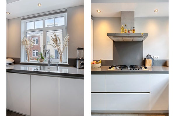 Aan de voorzijde ligt de luxe hoekkeuken, volledig uitgerust met inbouwapparatuur en slechts 8 jaar oud. Zo is er een Quooker, een vaatwasser, een combi-oven en een gewone oven, de koelkast, een vriezer en een 5-pits gaskookplaat met afzuigkap> door zijn hoek is er ook heel veel kastruimte aanwezig. We zo fijn als je van koken houdt. Terug naar de woonkamer. De woonkamer voelt echt als één grote leefruimte die je naar de zonnige achtertuin trekt.