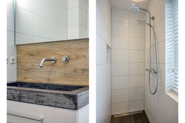 Ook boven ervaar je ruimte en luxe. De verdieping telt nu twee slaapkamers (voorheen drie) en heeft werkelijk een schitterende badkamer. Een echte wellness-sfeer met een hangend toilet, een breed wastafelmeubel en een diepe inloopdouche.