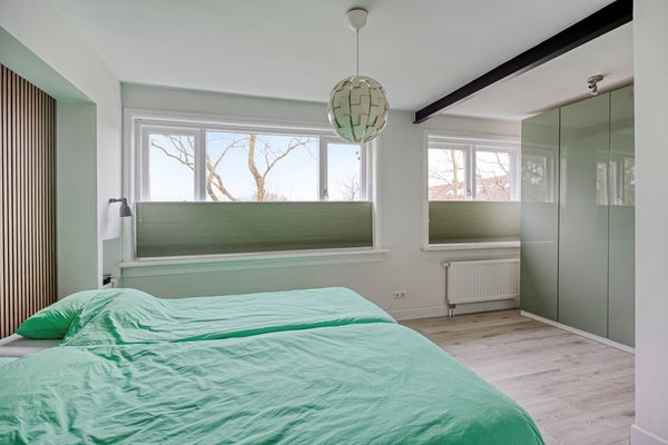 De voorslaapkamer was oorspronkelijk opgesplitst in twee kamers. De huidige bewoners hebben hier een stijlvolle en-suite kledingruimte van gemaakt, echt heel gaaf. Met een eenvoudige wand is hier weer een extra kamer te creëren. De tweede slaapkamer aan de achterzijde is strak afgewerkt, heerlijk licht (groot genoeg voor minimaal een tweepersoonsbed) en biedt toegang tot het platte dak van de uitbouw. Let je ook weer op alle details wat dit huis zo bijzonder maakt?