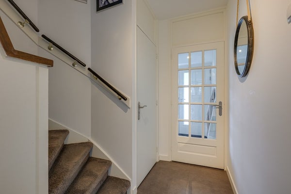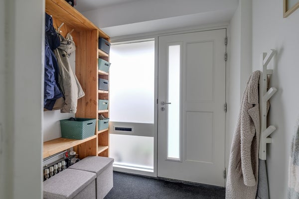Overdekte entree, gevolgd door de vestibule. Hal met toilet, vaste kast en trapopgang.