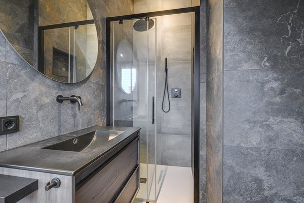 De badkamer is recent vernieuwd en uitgerust met een dubbel wastafelmeubel, hangend toilet, ruime inloopdouche en veel lichtinval.