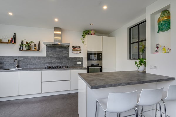 De moderne open keuken vormt het hart van de woning en geeft direct toegang tot de zonnige achtertuin. Vanuit de tuin loop je zo de garage in – ideaal voor fietsen, opslag of hobby’s.
