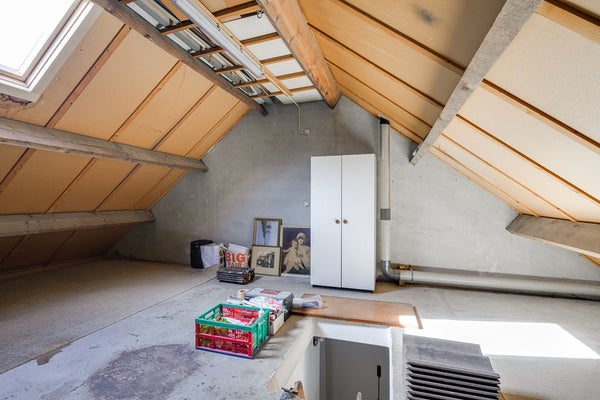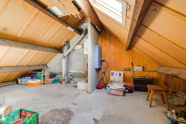 De zolderverdieping – bereikbaar via een vlizotrap – biedt volop mogelijkheden om uit te bouwen tot volwaardige verdieping. Hier kun je eenvoudig twee extra slaapkamers of een werkkamer realiseren.
