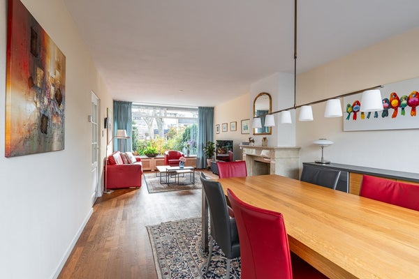 De doorzonwoonkamer strekt zich moeiteloos uit van voor naar achter. Het grote voorraam vangt de ochtendzon, terwijl je aan de achterzijde uitkijkt op het groen. De houten vloer, de lengte van de ruimte en de klassieke schouw maken dit tot een warme leefplek waar je automatisch zachter gaat praten.