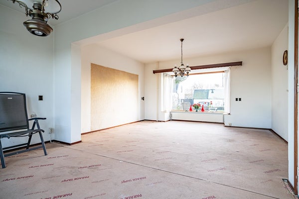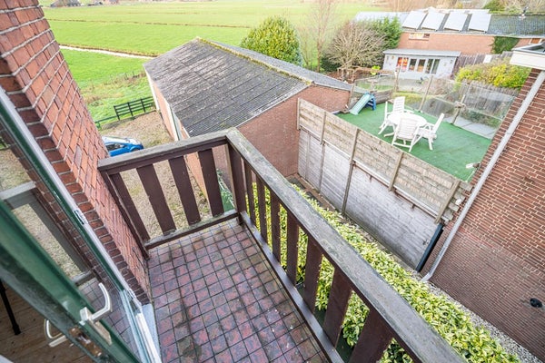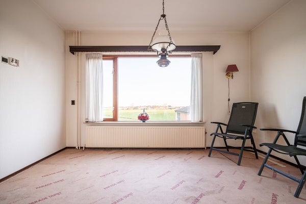 De doorzonwoonkamer is heerlijk licht dankzij de grote raampartijen. Wat hier direct in het oog springt, is het prachtige, vrije uitzicht over de landerijen – een uitzicht dat nooit verveelt. De keuken bevindt zich aan de achterzijde van de woning en biedt toegang tot de ruime kelder onder de woning.