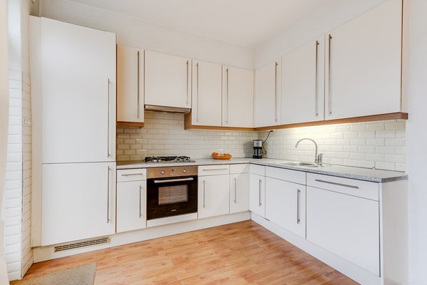 De moderne keuken is uitgevoerd in een lichte kleurstelling en voorzien van diverse inbouwapparatuur en veel kastruimte. Vanuit de eetkamer geven deuren toegang tot de diepe achtertuin, waar privacy, zon en praktische bergruimte samenkomen. De stenen berging en achterom zorgen voor extra gemak.
