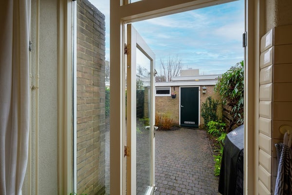 De achtertuin is onderhoudsvriendelijk aangelegd en beschikt over een achterom en stenen berging. Een fijne plek om te ontspannen of kinderen veilig buiten te laten spelen.