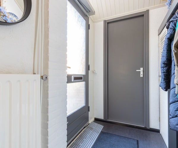 Vanuit de woonkamer is een tussenhal bereikbaar met toegang tot de toiletruimte en de trap naar de eerste verdieping. Aan de voorzijde van de woning bevindt zich daarnaast een praktische inpandige berging, ideaal voor het stallen van fietsen, voorraad of huishoudelijke spullen. Deze ruimte is zowel vanuit de hal als direct vanaf buiten toegankelijk, waardoor hij extra gebruiksvriendelijk is.