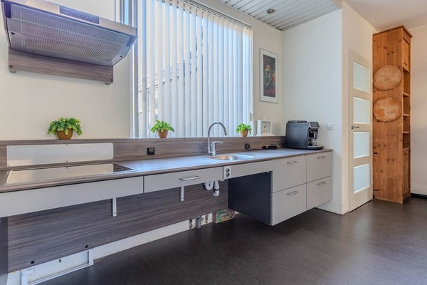 Aan de voorzijde ligt de ruime half open keuken. Dankzij de strakke opstelling heb je veel werkblad, kastruimte en licht. Daarbij is er een grote inloopkast met veel bergruimte onder de trap en beschikt de keuken over diverse inbouwapparatuur.