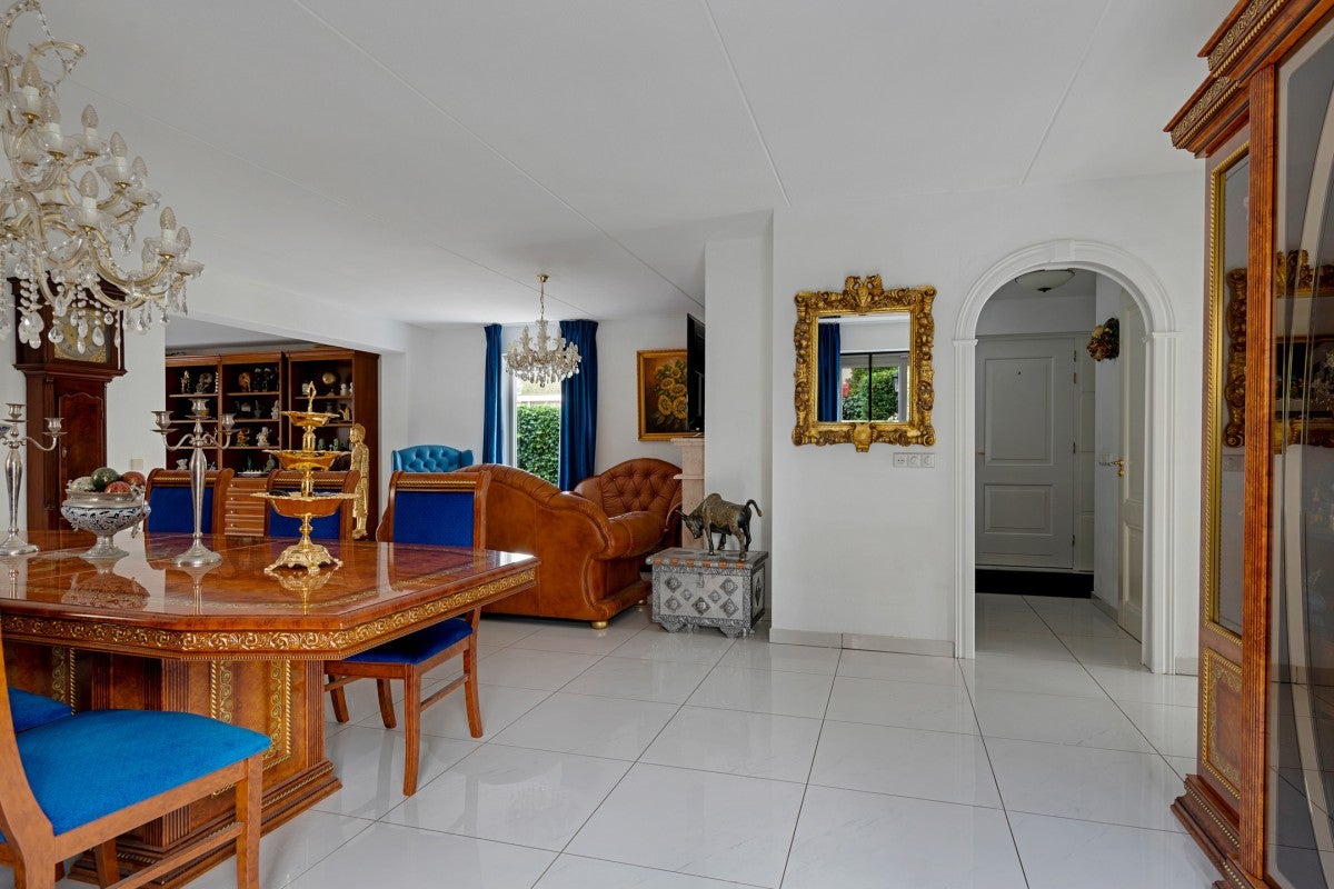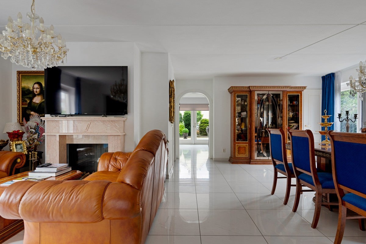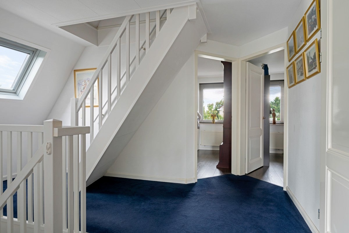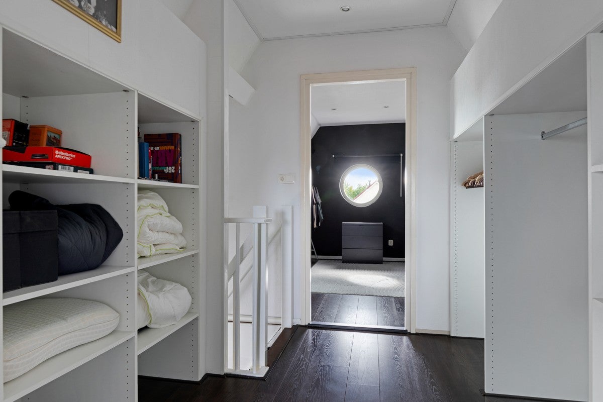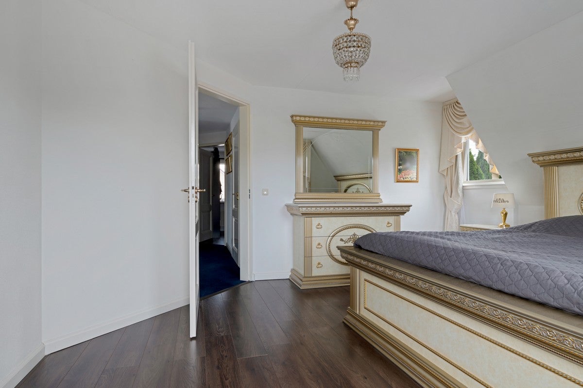 Op de eerste verdieping zijn drie slaapkamers, waaronder een hoofdslaapkamer met inloopkast en een luxe badkamer. Op de zolder zijn nog eens twee slaapkamers aanwezig. De onderhoudsvriendelijke tuin heeft een groot terras, een verwarmd zwembad, en voldoende ruimte voor een carport.