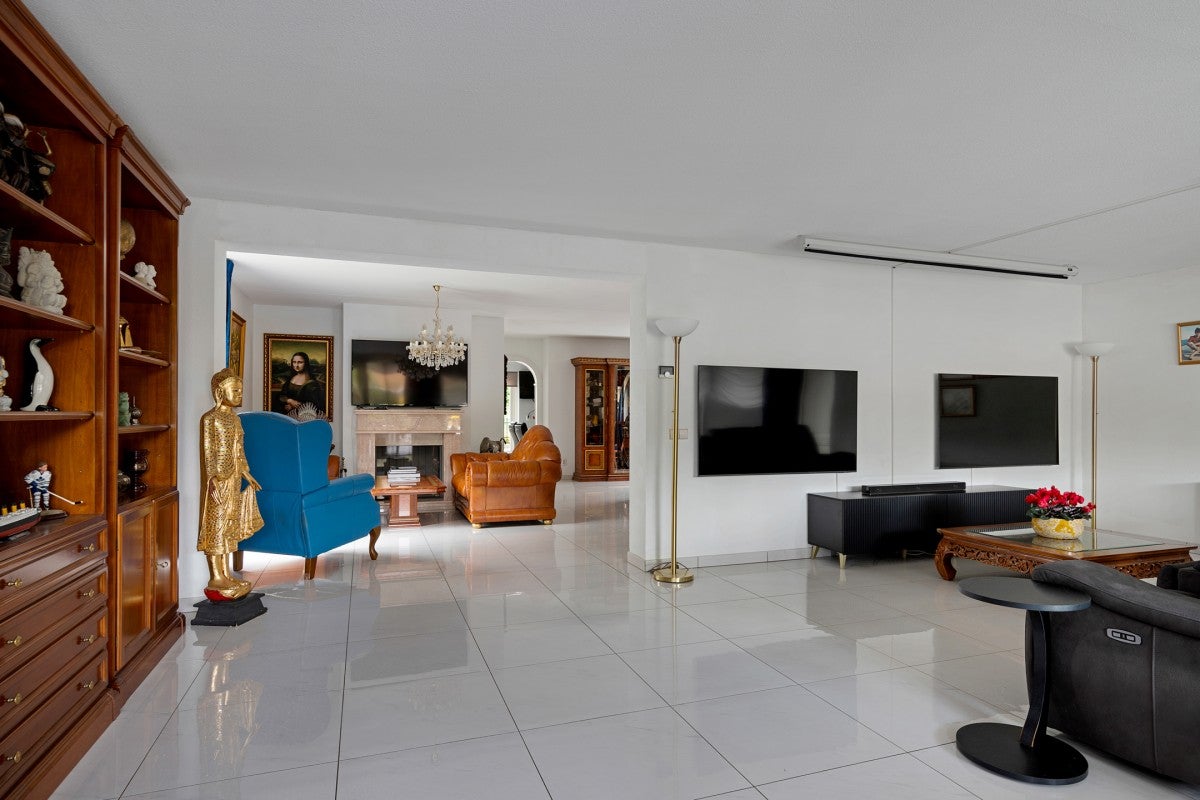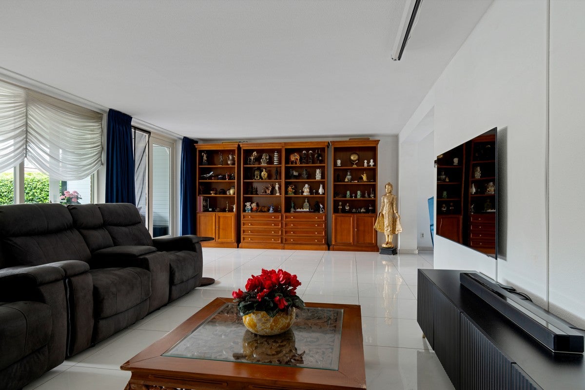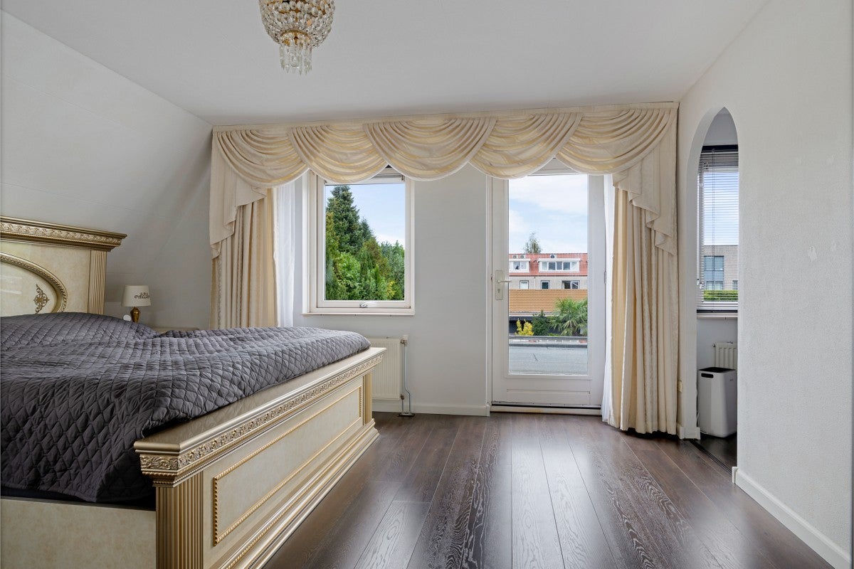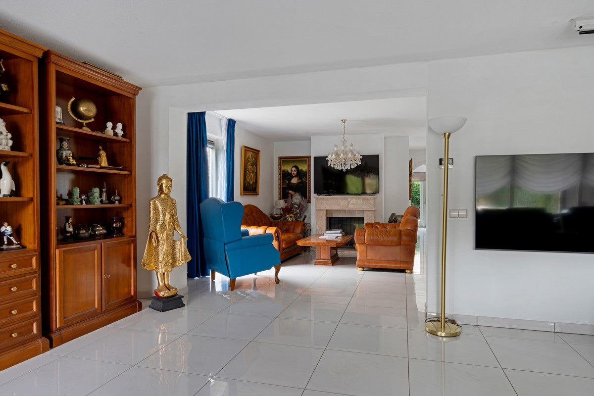 Op de eerste verdieping zijn drie slaapkamers, waaronder een hoofdslaapkamer met inloopkast en een luxe badkamer. Op de zolder zijn nog eens twee slaapkamers aanwezig. De onderhoudsvriendelijke tuin heeft een groot terras, een verwarmd zwembad, en voldoende ruimte voor een carport.