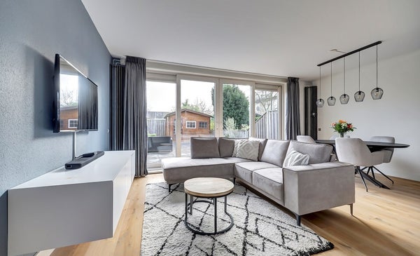 The well-maintained rear garden offers a high degree of privacy and is a wonderful place to relax. A recently installed electric awning spans the full width of the rear façade, ideal for sunny days and long summer evenings. The garden is neatly landscaped and forms a natural extension of the living room.