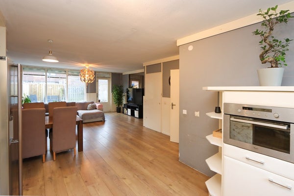 Via de verzorgd aangelegde voortuin bereik je de woning. In de hal bevinden zich de meterkast, een toilet, de trapopgang naar boven en de toegang tot de woonkamer. De tuingerichte woonkamer biedt dankzij grote raampartijen en een deur direct contact met de achtertuin. Aan de voorzijde is een lichte keuken in U-opstelling geplaatst, voorzien van veel werk- en bergruimte en uitgerust met diverse inbouwapparatuur, waaronder een gaskookplaat, afzuigkap, combi-oven, koelvries-/combinatie en vaatwasser. De begane grond is geheel afgewerkt met een laminaatvloer.
