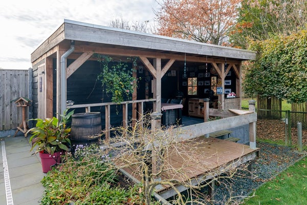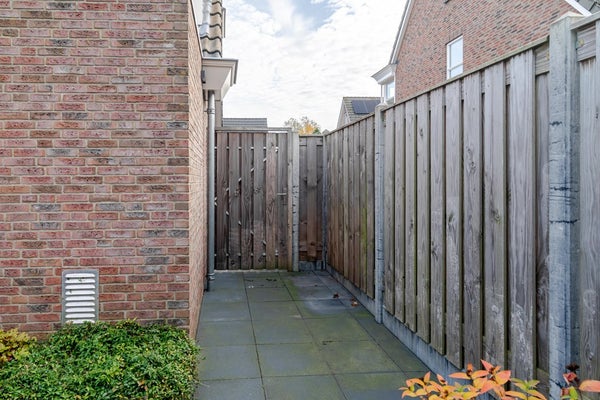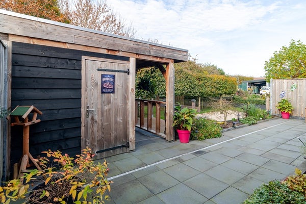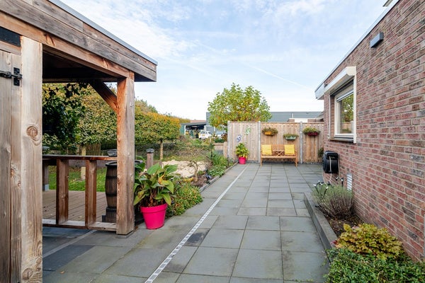 De achtertuin ligt op westen en biedt veel privacy. De tuin is voorzien van een terras, borders en gras. Opvallend is het hoogteverschil dat de inrichting speels maakt. Vanuit de royale overkapping kijkt u uit over de dierenweide die achter de woning ligt. Aan de voorzijde is een carport en een oprit met ruimte voor 2 auto’s.