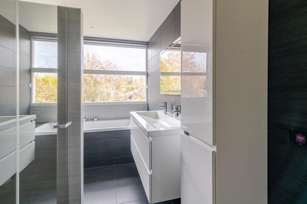 De overloop biedt toegang tot 4 nette slaapkamers (14, 11, 11 en 6 m2) en de badkamer. De ouderslaapkamer ligt aan de voorzijde en is voorzien van een kastenwand. De moderne, complete badkamer is voorzien van een ligbad, een inloopdouche, een dubbel wastafelmeubel met opbergkast en een wandcloset. De airco op de overloop koelt of verwarmt deze verdieping.
