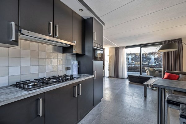 entree/hal, modern toilet met douche, meterkast, tuingerichte woonkamer met schuifpui en open keuken met inbouwapparatuur zoals: 6-pits gasfornuis met afzuigkap, oven, koelkast en vaatwasser.