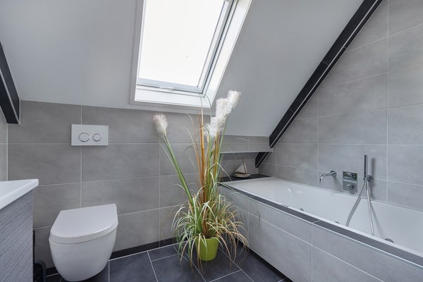overloop, 3 slaapkamers waarvan 1 met sauna, moderne badkamer voorzien van: toilet, ligbad en wastafelmeubel.