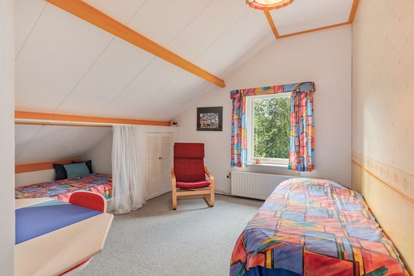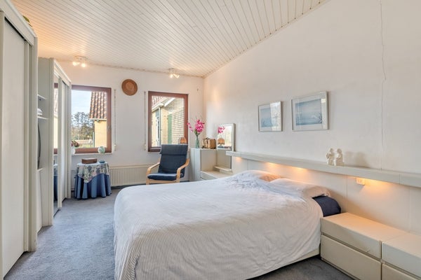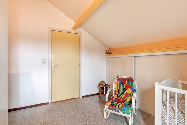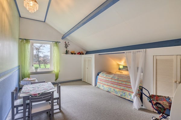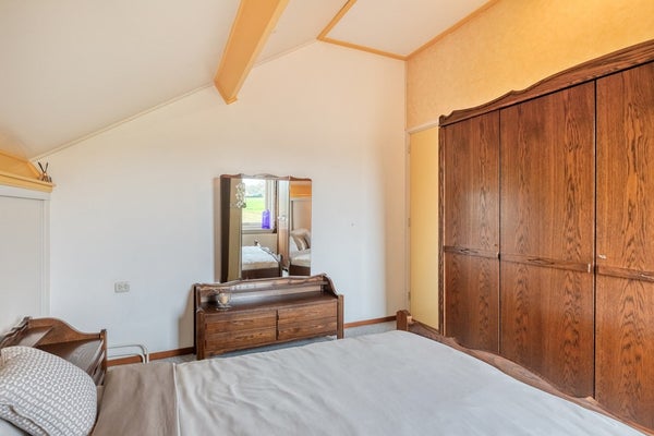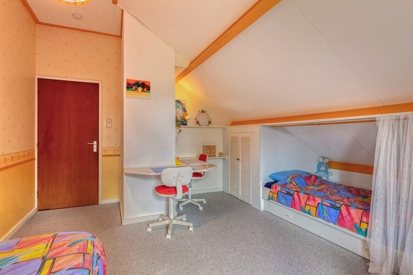 Slaapkamer 4 is afgewerkt met vloerbedekking, deels behangen en deels gesauste wanden en plafondplaten. De slaapkamer is voorzien van riante knieschotkasten.
