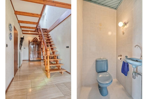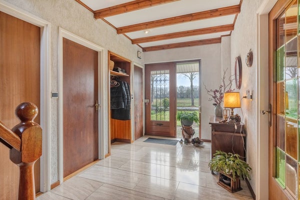 Bij aankomst zijn jullie direct onder de indruk van de woning en het bijzondere plekje. Na het parkeren van de auto in de dubbele garage zetten jullie de eerste stappen naar binnen en worden jullie verwelkomd door de ruime entree. De hal c.q. entree is afgewerkt met en travertin tegelvloer, sierpleister wanden en een houten balken plafond. De entree biedt toegang tot de meterkast, betegeld toilet met fonteintje, woonkamer, keuken, 2 slaapkamers, badkamer en eerste verdieping middels een vaste trapopgang.
