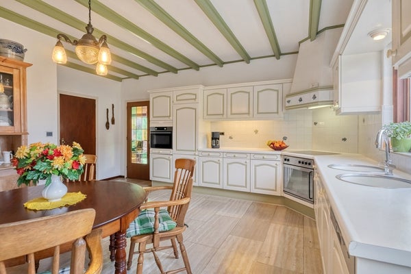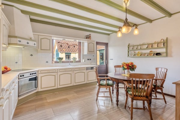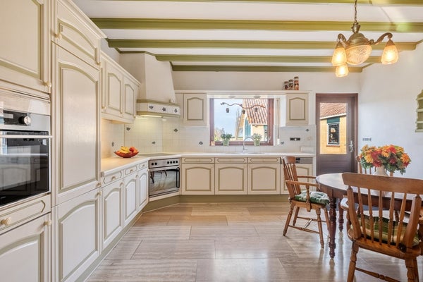 Wat een ruimte! Deze riante woonkeuken biedt voldoende ruimte om heerlijke recepten te bereiden! De woonkeuken is afgewerkt met een travertin tegelvloer, gesauste wanden en een houten balken plafond. De in hoek opgestelde keukeninrichting is voorzien van een kunststof keukenblad, onder- en bovenkastjes, keramische kookplaat, oven, afzuigkap, koelkast, vriezer, vaatwasser en combimagnetron. De keuken beschikt over rolluiken en biedt toegang tot de berging welke voorzien is van de aansluiting voor witgoed. Via de keuken komt u in de achtertuin.