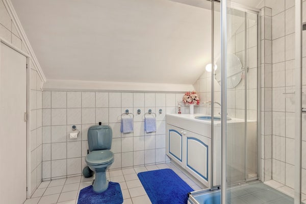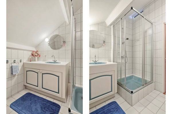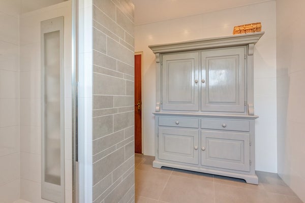 De badkamer is afgewerkt met een betegelde vloer, betegelde wanden en gesaust plafond. De badkamer is voorzien van een douchecabine, 2e toilet, wastafelmeubel en biedt toegang tot de bergruimte.
