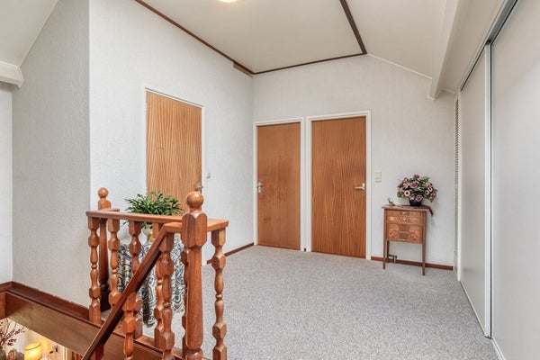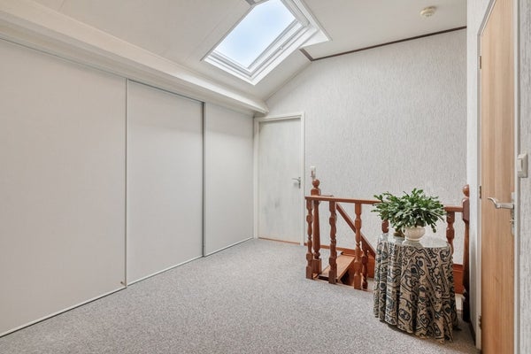Middels de vaste trap op de begane grond bereiken jullie de overloop op de eerste verdieping. De overloop is afgewerkt met vloerbedekking, sierpleister wanden en plafondplaten. De overloop is voorzien van een kastenwand met CV-Ketel (Remeha, WHB Avanta 28C CCS, 2011) en biedt toegang tot 4 slaapkamers (welke allemaal zijn voorzien van rolluiken) en de badkamer.