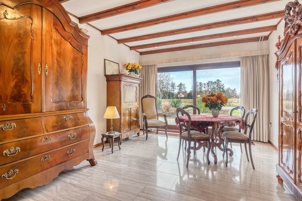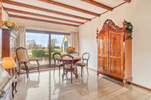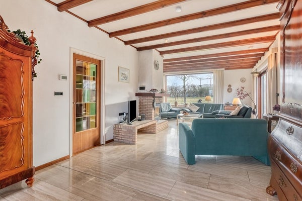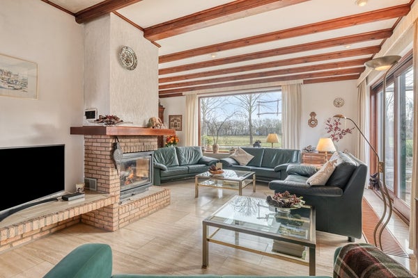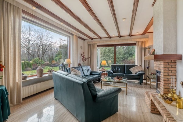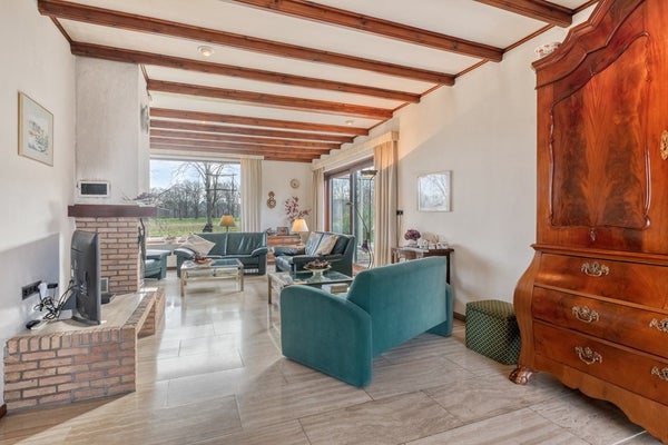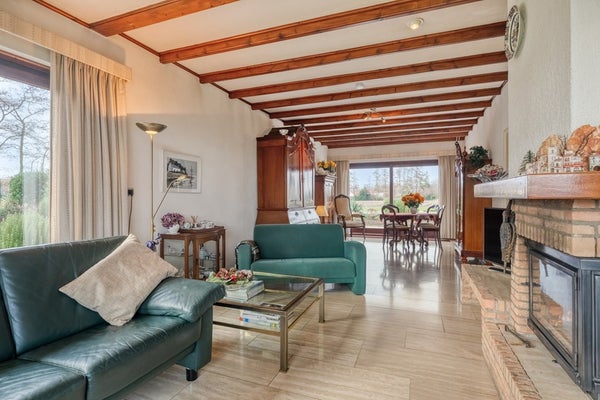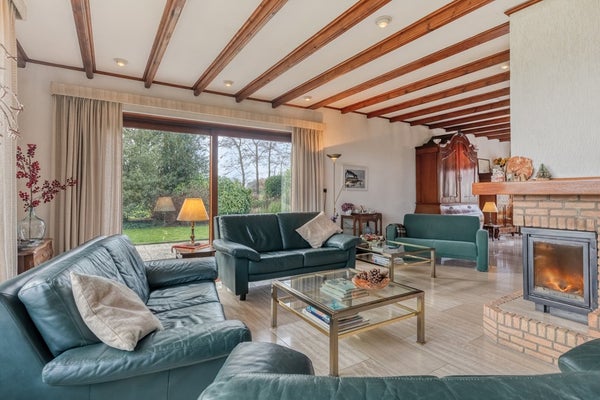 Kom met ons in de woonkamer zitten waar we een prachtig panoramisch uitzicht op prachtig groen hebben en jullie zijn verkocht! De woonkamer is afgewerkt met een travertin tegelvloer, gesauste wanden en een houten balken plafond. De woonkamer is voorzien van een openhaard, convectorputten, hardhouten schuifpuien en elektrische rolluiken.