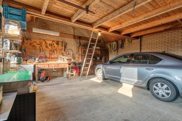 De vrijstaande stenen garage bestaat uit twee delen en heeft een totale oppervlakte van maar liefst 110 m². Het eerste deel van de garage beschikt over twee garagedeuren, krachtstroom en een loopdeur richting de tuin. Het tweede deel van de garage heeft tevens een tuindeur en twee openslaande deuren. Beide zijn voorzien van elektra (krachtstroom) en beschikken over een vliering.