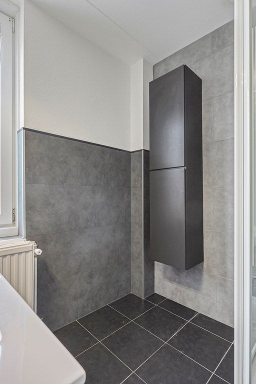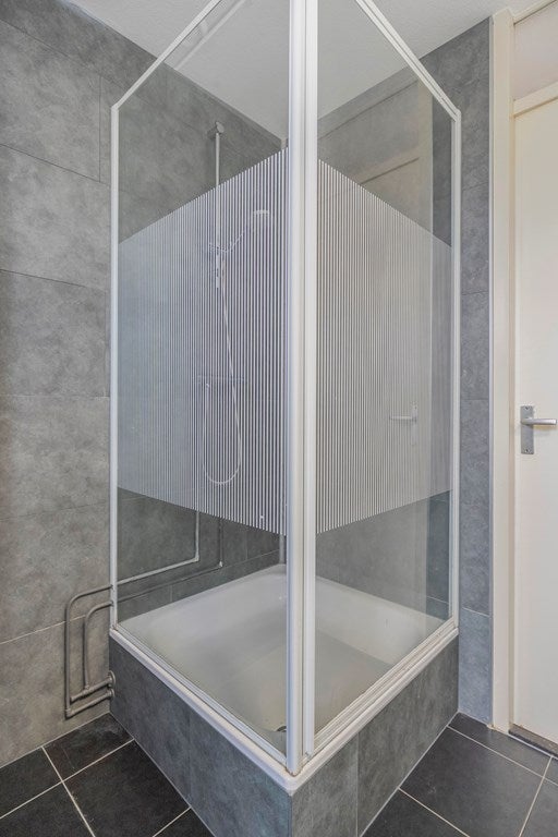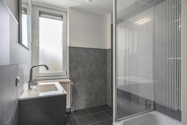 De moderne badkamer is voorzien van een douchecabine en een wastafel met opbergmeubel.